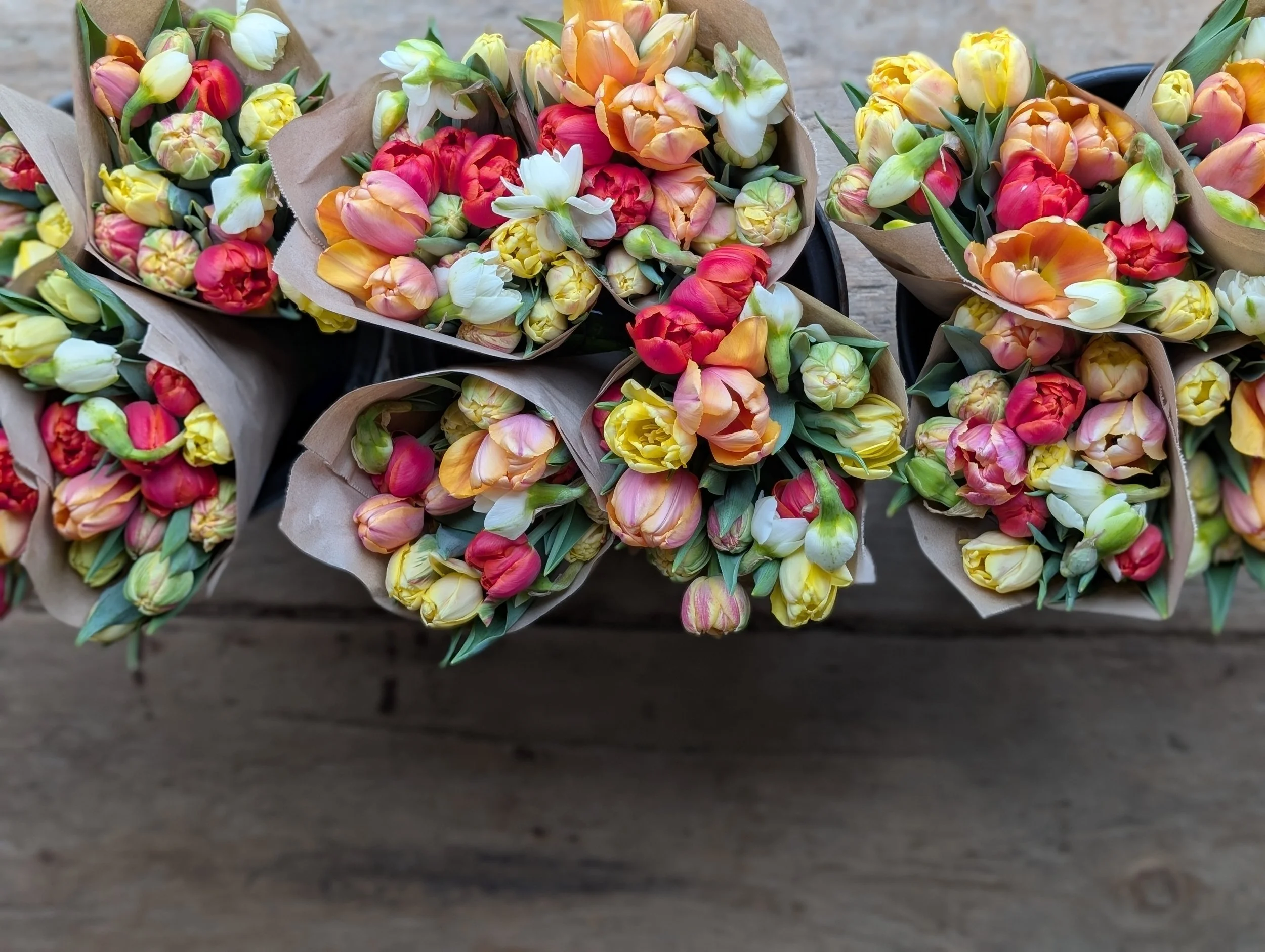 A sweet simple bunch of farm-grown tulips. Each bunch includes one dozen specialty tulips, gathered from what’s blooming in the field and wrapped in kraft paper. Harvested at just the right stage for the longest vase life, the blooms will continue to open and put on a beautiful show in the vase.